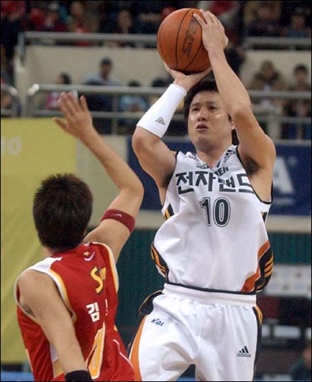 전자랜드 슈터 문경은(오른쪽)이 오리온스 김병철을 앞에 두고 3점슛을 시도하고 있다/ 사진=인천 전자랜드 홈페이지 http://www.etblackslamer.com/