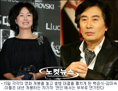 내년 개봉하는 ''연인''에서는 부부로 등장하는 백윤식 김미숙 커플은 현재 영화를 통해 부부애를 쌓아가고 있지만 공교롭게도 오는 15일 각자 연기한 영화를 놓고는 치열한 흥행 대결을 벌일 예정이다.