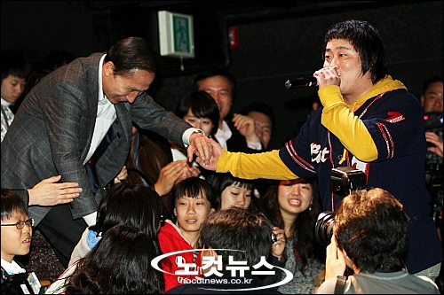 이명박 한나라당 후보가 4일 오후 서울 홍대 비보이전용극장에서 ''비보이를 사랑한 발레리나''를 관람한 뒤 비보이 손에 이끌려 무대로 나서고 있다.