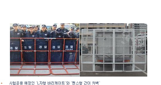 11일 시험운용 예정인 ''L자형 연결 바리케이트''는 신속하게 설치가 가능하면서도 시위대가 쉽게 밀거나 당길 수 없게 돼 있다. 차량에 부착되는 펜스형 간이 차벽은 시위대의 진출입을 가로막는 장비다.