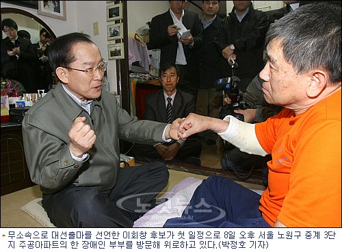 이 후보는 장애인 부부를 방문한 자리에서 "생활은 어떻게 하시냐, 나라에서는 얼마만큼 보조해주는 지" 등을 물었고, 장애인 이기옥씨는 "올해 장애수당이 6만원 올랐으나 물가도 똑같이 올라버려 ''연명''하는 수준"이라며 어려움을 호소했다.