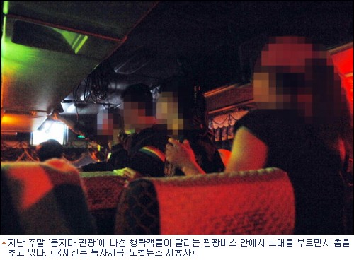 [BestNocut_L]자리 배정이 끝난 후에는 술판이 벌어졌다. 먼저 커튼으로 차창을 가리자 버스에 실려 있던 술이 나돌기 시작했다. 술에 취한 일행은 자리에서 일어나 춤을 추고 노래를 불렀다. 목적지에 도착해서도 대부분의 사람은 관광은 뒷전이었고, 버스에 그대로 남아 계속 술판을 벌였다.