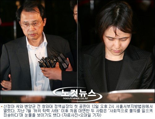 허위학력과 횡령, 직권남용 등의 혐의로 구속기소된 신정아 씨와 변양균 전 청와대 정책실장의 첫 공판이 12일 오후 2시 서울서부지방법원에서 열렸다.