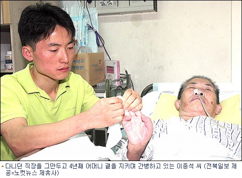4년째 병석에 누워있는 어머니 이숙자씨(71)를 간호하는 이종석씨(33·완주군 동상면). 그의 어머니는 지난 2004년 뇌출혈로 쓰려져 병석에 누웠다. 모친은 지난 2006년 병세를 회복하는 듯 했지만, 출혈이 멎지않아 다시 병석에 눕게됐다. 지난 7월에는 암으로 투병 중이던 부친마저 세상을 떴다.