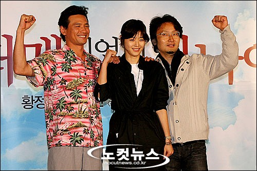 [BestNocut_R]28일 오후 경기도 파주 세트장에서 열린 영화 ''슈퍼맨이었던 사나이''(정윤철 감독·CJ엔터테인먼트제작) 현장공개에서 정윤철 감독(오른쪽)과 주연배우인 황정민, 전지현이 취재진을 향해 포즈를 취하고 있다.