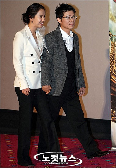 30일 오후 용산 CGV에서 열린 섹시 코미디 영화 색즉시공2의 언론시사회에서 송지효와 임창정이 손을 꼭 잡고 간담회 무대로 이동하고 있다.