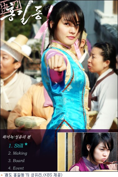지난주 홍길동 역을 맡은 강지환에 이어 이번에 공개된 성유리의 동영상에는 그동안 갈고 닦은 칼 휘두르는 솜씨를 비롯해 활기찬 무술 실력을 보여주는 등 털털하고 수더분한 모습이 한껏 묻어났다.