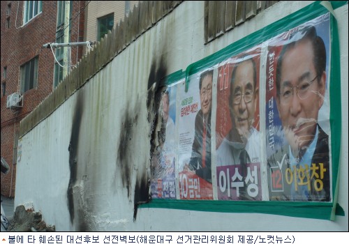 특히 부산지역의 경우 전국에서 가장 많은 선거벽보 훼손이 일어났고, 현수막에 불까지 붙이는 유례없는 엽기 행각도 발생하고 있다. [BestNocut_R]