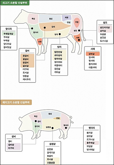 이에따라 소·돼지 고기 판매업소는 대분할 부위명칭을 표시하여 식육을 부위별로 구분 판매하여야 하며, 소비자의 이해를 돕기 위해 소분할 부위명칭을 사용하려는 경우 소분할 부위명칭을 표시해야한다.