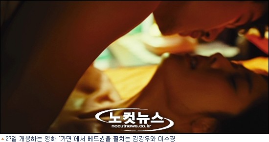 김강우는 오는 27일 개봉하는 스릴러물 ''가면''에서 애인 차수진(이수경)과 격정적 베드씬을 예고하고 있다. 둘다 작품에서는 첫 베드씬. 무려 7시간동안 촬영에 임해 3분여의 숨죽인 정사장면을 보여준다.