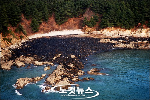 [BestNocut_R]사상 최악의 원유 유출 사고 엿새째를 맞는 12일 오후, 멈칫했던 기름띠가 확산 저지선인 가의도 해역을 뚫고 남쪽으로 다시 번져 비상이 걸린 가운데 충남 태안 만리포 인근 해안선의 파식대에 기름이 가득 차 있다.