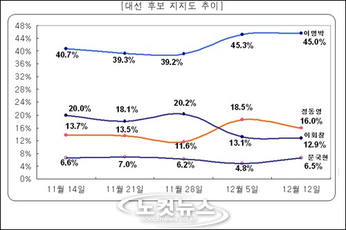 CBS와 리얼미터(대표: 이택수)의 주간 전화면접 조사결과, 이명박 후보는 45.0%로 고공행진을 계속했으며 지난주 2위로 올라선 정동영 후보는 전주대비 2.5%p 하락한 16.0%, 이회창 후보는 전주대비 0.2%p 빠진 12.9%를 기록했다.