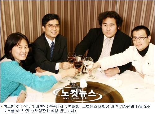 12일 만난 창조한국당 장유식 대변인은 정치인보다는 시민사회 일원으로서 더 오래살았다. 그래서 장 대변인은 시민단체에서 일하며 가졌던 자신의 꿈과 이상을 이루기 위해 부인의 반대를 무릅쓰고도 문국현 후보를 돕게 되었다고 한다.