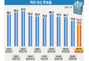 역대 대선 투표율은 직선제가 부활된 지난 1987년 89.2%를 기록한 뒤 92년 81.9%, 97년 80.7%, 2002년 70.8% 등 계속 낮아지는 추세를 보이고 있다.