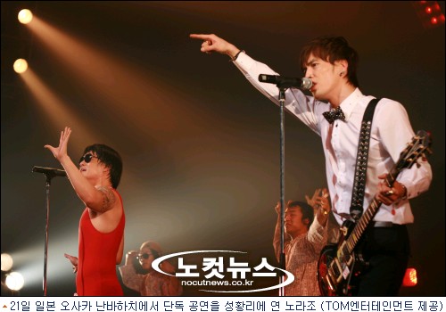 그룹 노라조(조빈·이혁)가 21일 일본 오사카 난바하치에서 단독 콘서트를 열고 현지 팬들의 호기심에 답했다. 특유의 발칙한 무대는 여느 한류 가수들과는 확실히 다른 독특한 매력이 넘쳐났다.