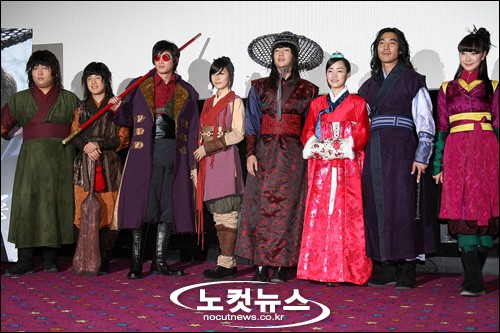 [BestNocut_R]26일 오후 서울 용산CGV에서 열린 KBS미니시리즈 퓨전사극 ''쾌도 홍길동''(연출 이정섭, 극본 홍미란, 홍정은) 제작발표회에서 (왼쪽부터) 출연배우인 문세윤, 맹세창, 강지환, 성유리, 장근석, 김리나, 박상욱, 차현정이 취재진을 향해 포즈를 취하고 있다.