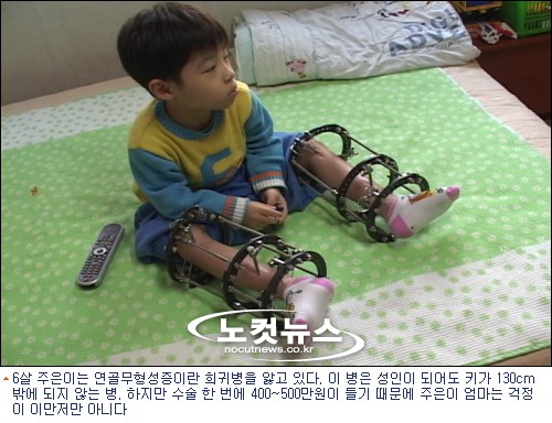 [BestNocut_R]한창 뛰어 놀 나이에 양 다리를 감싸고 있는 무거운 쇳덩이 때문에 제대로 걸을 수도 없는 주은이(6). 아이는 연골무형성증이란 희귀병을 앓고 있다.
