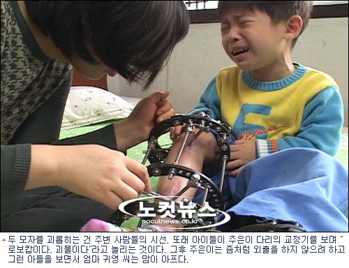 ▲ 사람들 시선이 주는 외로움 무엇보다 모자를 괴롭히는 것은 주변 사람들의 시선. 주은이가 놀이터를 가면 또래의 친구들이 주은이 다리의 교정기를 보며 "로보캅이다, 괴물이다" 라고 놀리는 것이다. 크게 상처받은 후로 주은이는 좀처럼 외출을 하지 않으려 했고, 그런 아들을 보면서 귀영 씨는 마음 아파했다.