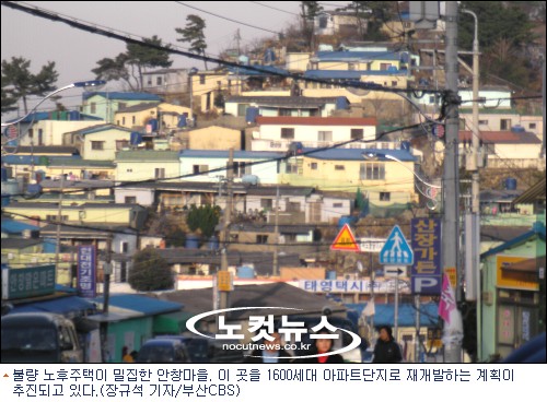마을주민 대부분 조합구성 참여 못 해안창마을에는 이미 조합추진위원회가 결성돼 운영되고 있는데, 추진위원회는 늦어도 오는 6, 7월까지는 재개발 조합 구성을 완료한다는 방침을 세우고 있다.