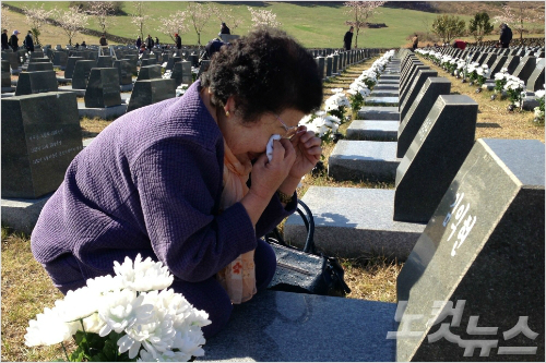 제주 4.3 평화공원을 찾아 눈물을 흘리는 4.3 유족. (자료사진)