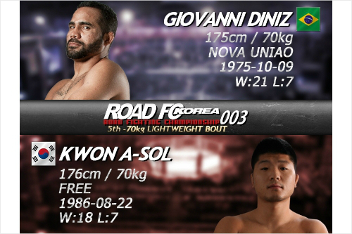 권아솔(28)은 6일 서울 양재동 ‘더 K호텔’에서 열린 ‘로드FC 코리아 3’ 대회 메인이벤트에서 지오반니 디니즈(39, 브라질)를 3라운드 2분 47초 만에 서브미션 기술인 리어네이키드 초크로 제압했다.