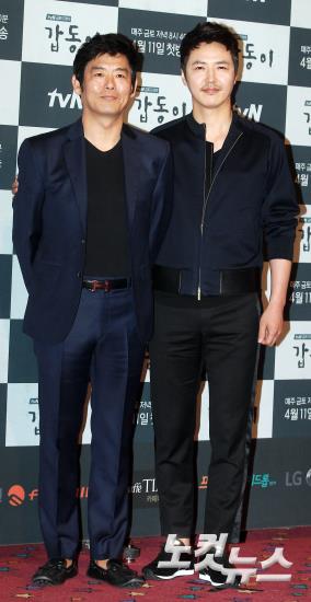 배우 성동일과 윤상현이 8일 오후 서울 용산 CGV에서 열린 tvN 금토드라마 ‘갑동이’ 제작발표회에서 취재진을 향해 포즈를 취하고 있다.