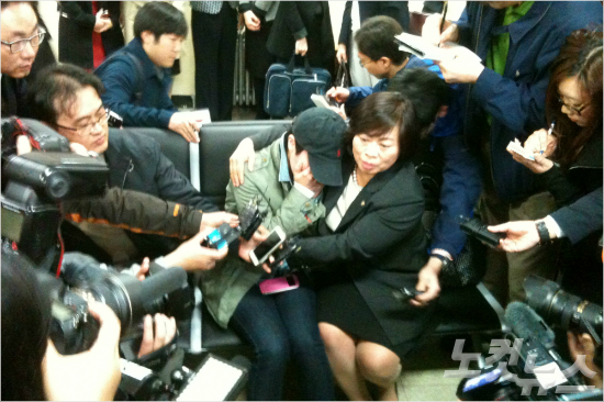 울산 계모 학대 의붓딸 사망사건 선고 이후, 법정에 나온 숨진 이 양의 생모와 한국여성변호사회 이명숙 회장이 취재진에 둘러싸여 있다. (사진=울산CBS 반웅규 기자)