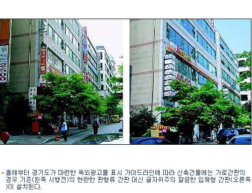 도가 14일 제시한 옥외광고물 표시 가이드라인에 따라 올해 1월부터 국토의 계획 및 이용에 관한 법률에 의한 지구단위계획 수립 지역과 옥외광고물 등 관리법에 의한 특정구역은 새로운 원칙이 적용되기 때문이다.