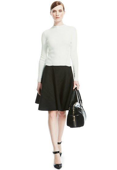 화려한 프린트의 원피스는 화이트 컬러의 재킷을 코디해 단정한 느낌을 잡아 주도록 한다. 블라우스에 복고풍의 블랙 플레어 스커트를 걸치면 차분하면서도 여성스러워 보인다.