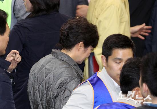 여객선 '세월호' 침몰 사고 이틀째인 17일 오후 실종자 가족들이 모여있는 전남 진도실내체육관을 찾은 박근혜 대통령이 피해 가족들을 격려한 후 고개를 숙인채 나서고 있다.