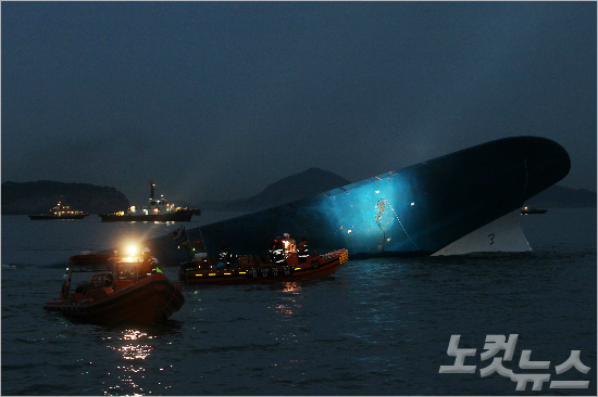 16일 오후 전남 진도군 관매도 인근 해상에서 인천에서 제주로 향하던 여객선 세월호가 선수쪽 선저부분을 제외한 나머지 부분 모두 침몰한 가운데 구조대원들이 야간 구조작업을 벌이고 있다. 윤성호기자