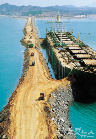 정주영 회장은 스웨덴에서 30억 원 짜리 폐유조선을 빌려와 방조제 공사 구간 가운데 구간을을 연결하는 마지막 공사에 유조선을 가라 앉혀 사이의 거센 유속을 줄여 10여 일 간 공사를 통해 방조제 건설을 마쳤다.