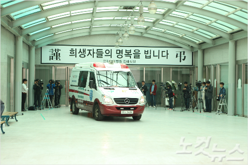 18일 고려대 안산병원 장례식장에 단원고 사망 학생 시신을 실은 앰뷸런스가 도착하고 있다.