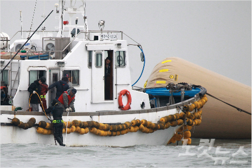 전남 진도군 관매도 인근 해상에서 침몰한 여객선 세월호의 위치를 확인하기 위한 대형 부표가 설치된 가운데 18일 오후 사고 인근해상에서 잠수부들이 구조할동을 벌이고 있다. 윤창원기자