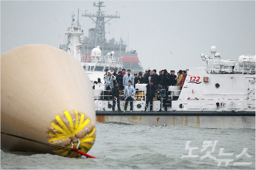 전남 진도군 관매도 인근 해상에서 침몰한 여객선 세월호의 위치를 확인하기 위한 대형 부표가 설치된 가운데 18일 오후 사고 인근해상을 찾은 실종자 가족들이 부표주위를 바라보고 있다. 윤창원기자