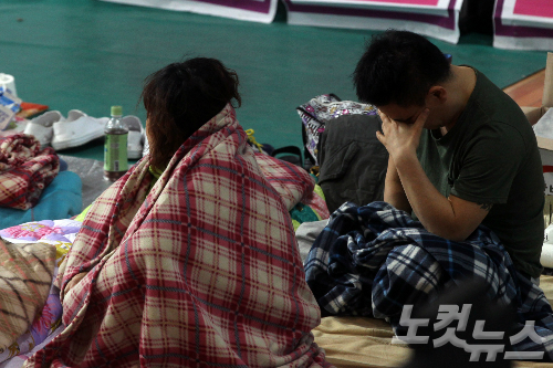 전남 진도군 실내체육관에서 지쳐보이는 실종자 가족이 구조소식을 기다리며 눈물짓고 있다. (사진=윤성호 기자)