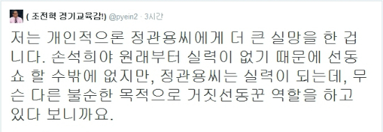 변희재 미디어워치 대표는 트위터를 통해 "손석희야 실력이 없기 때문에 선동쇼 할 수밖에 없지만 정관용 씨는 실력이 되는데 무슨 다른 불순한 목적으로 거짓선동꾼 역할을 하고 있다"며 비난했다.