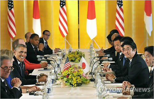 버락 오바마 미국 대통령과 아베 신조(安倍晋三) 일본 총리는 24일 도쿄에서 정상회담을 하고 미일 동맹과 지역 안보 방위협력 등을 강화해 나가기로 합의했다.