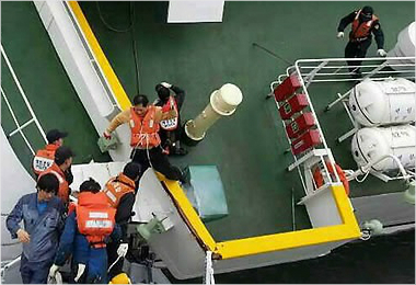 지난 16일 침몰한 세월호 선원들이 해경 경비정으로 탈출하고 있다.