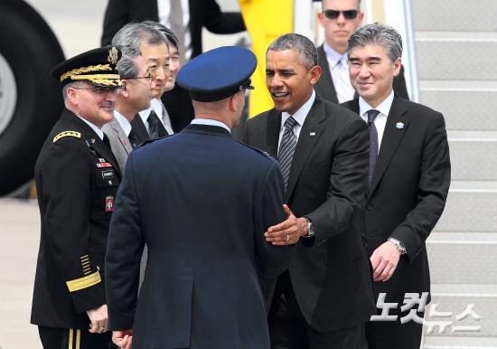 버락 오바마 미국대통령이 25일 오후 경기도 평택 오산 미공군비행장에 도착해 영접나온 미 공군관계자들과 인사나누고 있다. 박근혜 정부 출범 이후 첫 방한한 오바마 대통령은 1박 2일 일정으로 머물며 박 대통령과 정상회담을 갖는다.