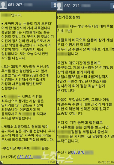 새누리당 부산시장 예비후보의 홍보 문자메시지(좌), 새누리당 수원시장 예비후보의 홍보 문자메시지.