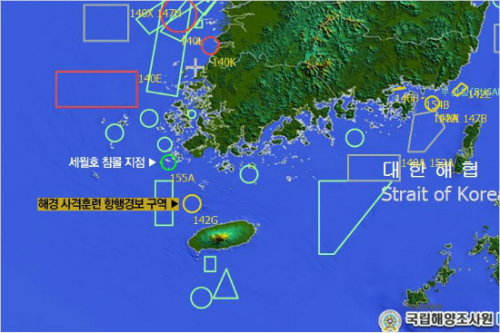 해경의 해상사격 훈련 지점은 세월호의 인천~제주간 항로의 바로 옆에 위치해 있어 VTS가 당연히 세월호에게도 공지해야할 중요정보입니다.