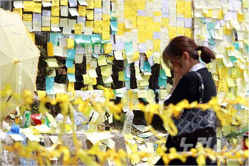 세월호 침몰 참사로 수많은 희생자들을 낸 경기도 안산시 단원고등학교가 24일 사고이후 첫 등교를 시작한 가운데 학교 주변으로 희생자들을 추모하고 기적을 기원하는 메모와 노란리본을 보며 한 시민이 눈물을 흘리고 있다. (윤창원 기자/자료사진)