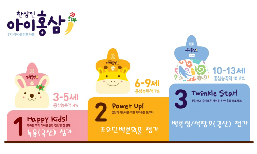 '아이홍삼 3단계'는 6년근 홍삼농축액(10.5%)에 국내산 백복령과 총명탕의 원료로 알려진 석창포를 추가하여 10-13세 어린이의 면역력 증진과 피로개선에 효과적이다.