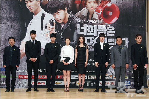 (왼쪽부터)유인식 감독, 배우 차승원, 이승기, 고아라, 오윤아, 안재현, 성지루, 박정민이 30일 오후 서울 목동 SBS 신사옥에서 열린 SBS 새 수목드라마 ‘너희들은 포위됐다’ 제작발표회에서 취재진을 향해 포즈를 취하고 있다.