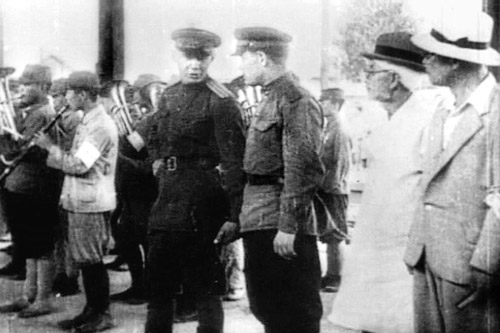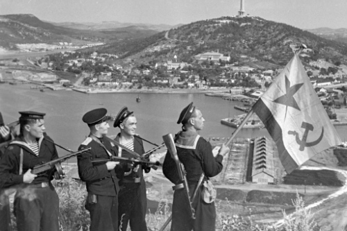 다롄시 인근에 있는 뤼순의 해군 기지를 점령한 소련 해군 병사들.