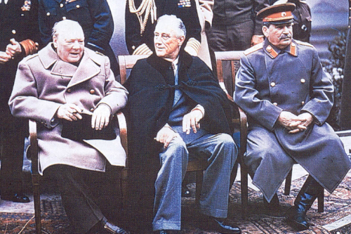 1945년 2월 9일 얄타의 리바디아 궁전 정원에서 사진기자들을 위해 포즈를 취한 3명의 거두. 이 회담에서 소련의 대일전 참전이 결정된다. 왼쪽부터 영국의 처칠 수상, 미국의 루즈벨트 대통령, 소련의 스탈린 수상