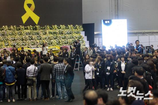 세월호 참사에서 생존한 단원고 학생들이 30일 퇴원과 함께 화랑유원지에 마련된 정부 합동분향소를 찾아 조문을 하고 있다.