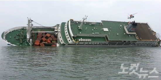 선체가 반쯤 기울어진 세월호 갑판에서 2, 3층으로 쌓여있던 컨테이너들이 뒤엉킨 채 바다로 쏟아졌다.