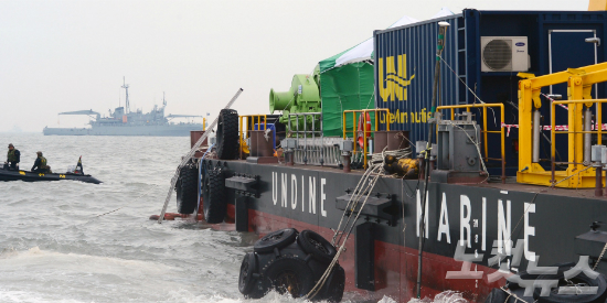 전남 진도군 관매도 인근 사고 해역에 수색작업을 위해 언딘 리베로 바지선이 정박해 있다. (사진=황진환 기자)